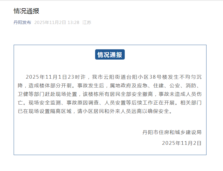 2025年11月1日23时许,我市云阳街道台阳小区38号楼发生不均匀沉降,造成楼体部分开裂。事故发生后,属地政府及应急、住建、公安、消防、卫健等部门赶赴现场处置,该楼栋所有居民全部安全撤离,事故未造成人员伤亡。现场安全监测、事故原因调查、人员安置等后续工作正在开展。相关部门已在现场设置隔离区域,请小区居民和外来人员远离以确保安全。