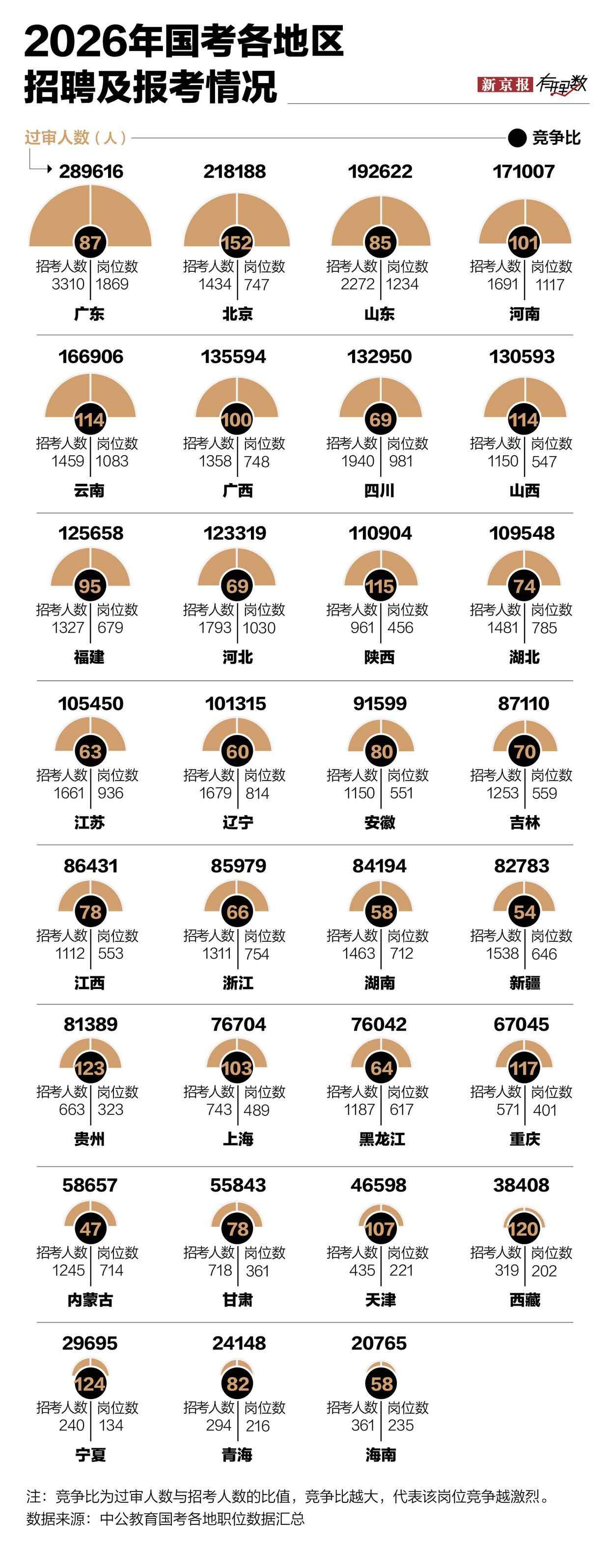 2026年度国考报名过审人数前三的地区是广东、北京和山东,竞争压力较小的四个地区分别是内蒙古、新疆、海南和湖南,其中内蒙古的竞争比为47:1,新疆54:1,海南和湖南分别为58:1。