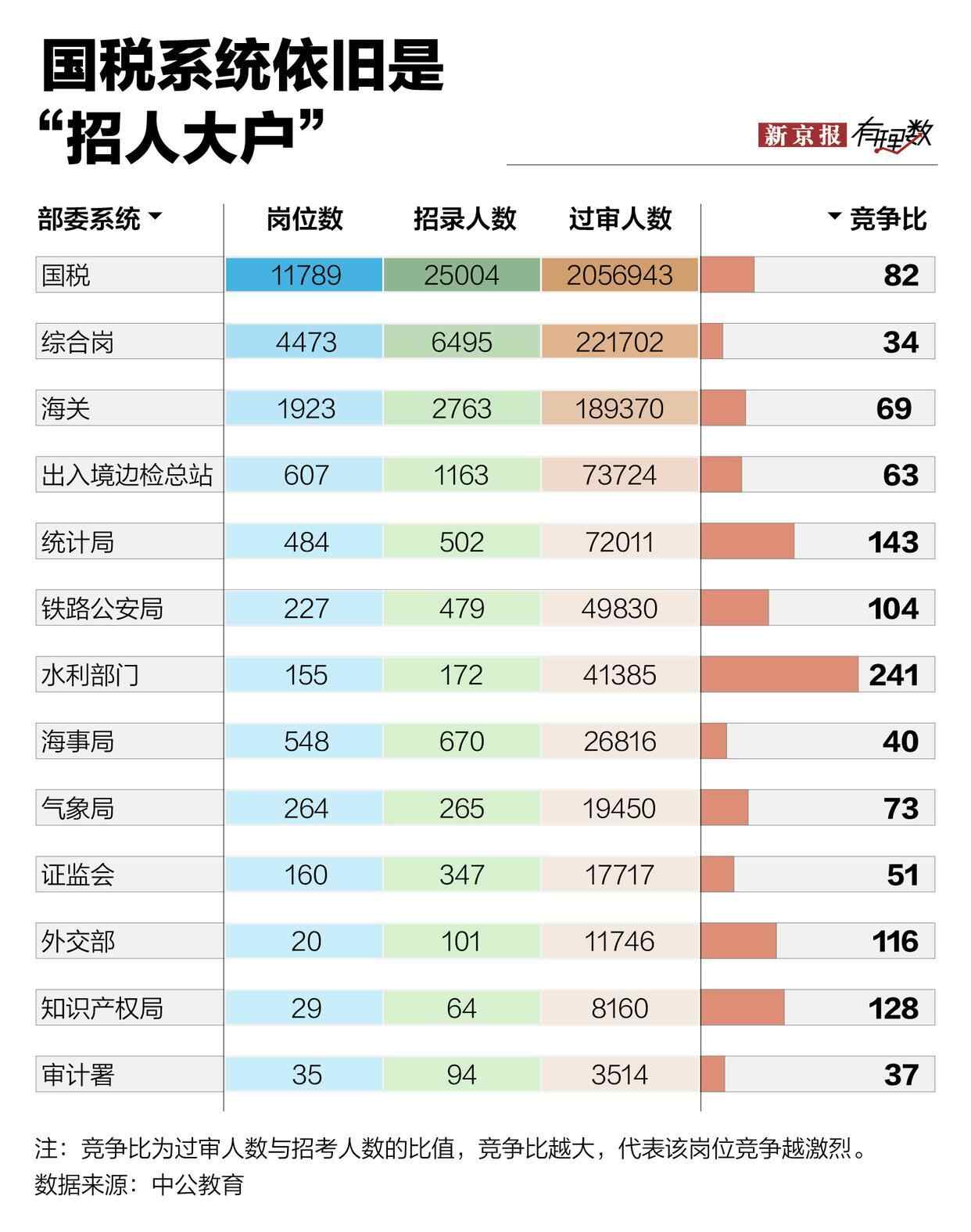 根据某教育机构的统计,2026年度国考税务系统计划招录25004人,约占总招录人数的65.6%,招录规模大,提供岗位多,所以国税系统每年报名的人数最多。水利部门虽然岗位数和招录人数都不占前列,但竞争比高达241:1,也就是说,平均每个岗位均有241人竞争,是今年竞争激烈的部门之一。