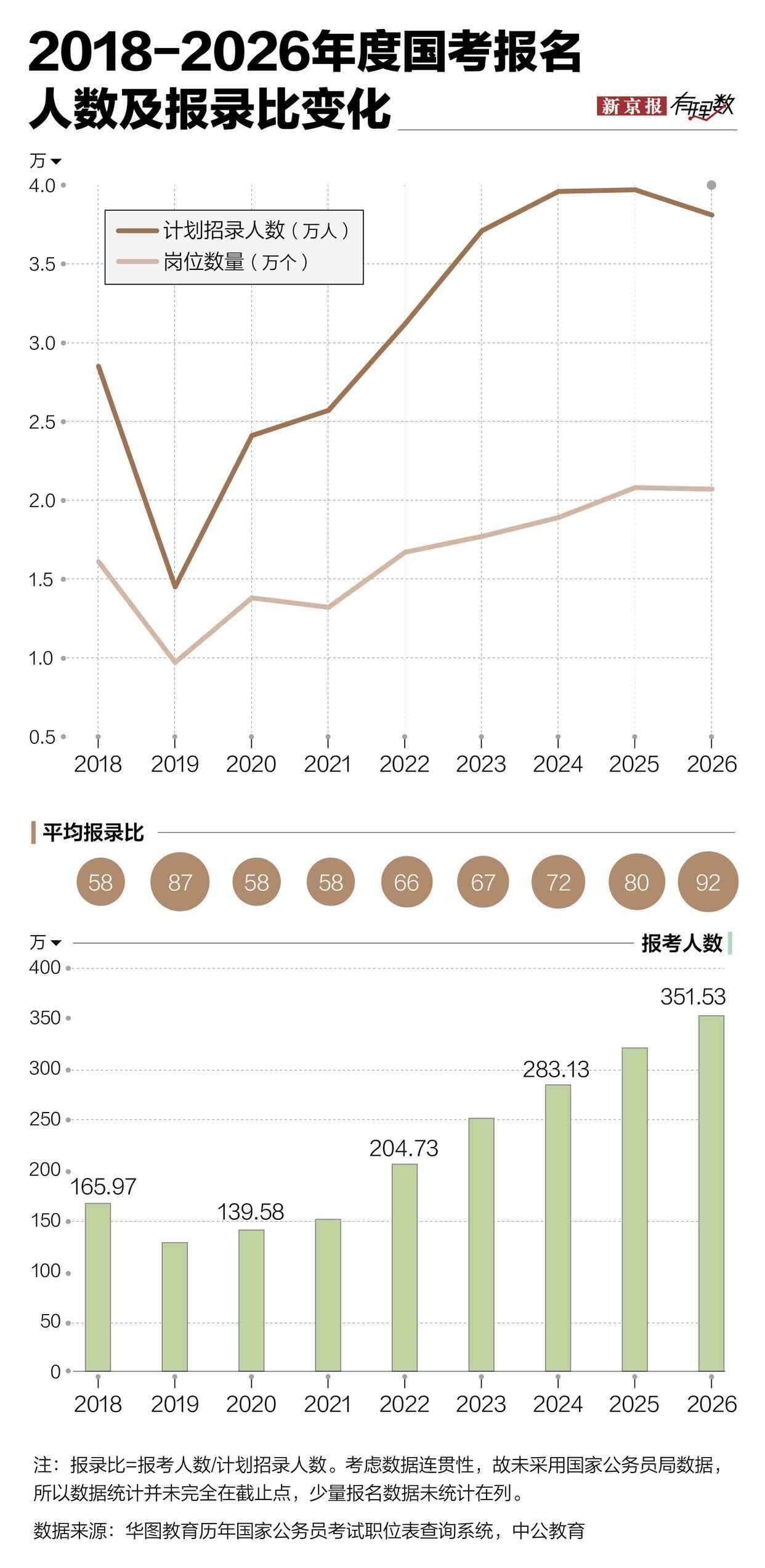 今年国考共推出20714个招录职位,计划招录38119人,同比2025年招录人数减少4%。虽然机会变少,但在国内,公务员的薪酬待遇、社会地位和长期发展空间,依然使其成为极具吸引力的选择。这直接导致今年的报录比比往年都高,竞争异常激烈。