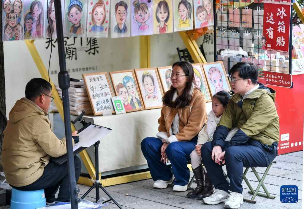在忻州古城,商户为游客画肖像漫画(10月25日摄)。