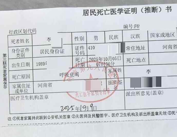 4日6时50分,患者出现呼吸暂停、意识丧失、呼之不应,后进ICU进行抢救。4日6时55分,医院下达病危病重通知书。医院出具的“居民死亡医学证明(推断)书”显示,李江的死亡日期为2025年10月5日7时36分,死亡原因为呼吸衰竭。
