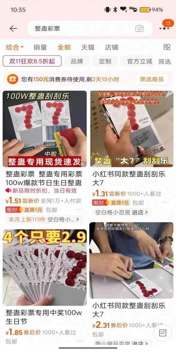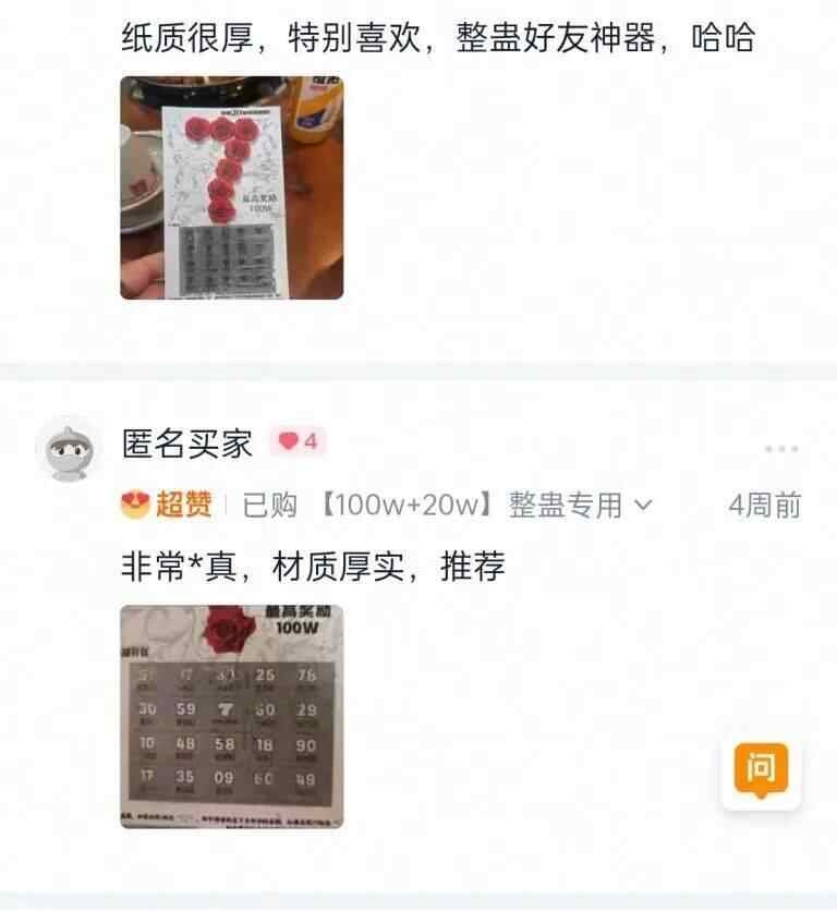 记者在电商平台搜索发现,这类“整蛊彩票”标价仅1-3元,奖金设置却很诱人,有8888元、20万、100万等不同金额。有商家销量已经破万,宣称仅供娱乐不可兑奖,整蛊朋友搞怪不伤人。不少购买者给予好评反馈,“非常真!和彩票一样,成功骗过朋友!”据悉,除电商平台外,地铁站、地下通道等也有“整蛊彩票”流通销售。