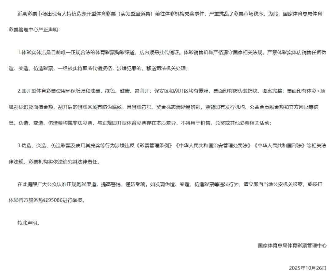 10月26日,国家体育总局体育彩票管理中心发布严正声明称,彩票市场有人持仿造即开型体育彩票(实为整蛊道具)前往体彩机构兑奖事件已严重扰乱了彩票市场秩序。