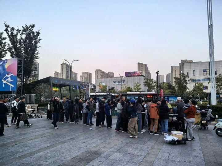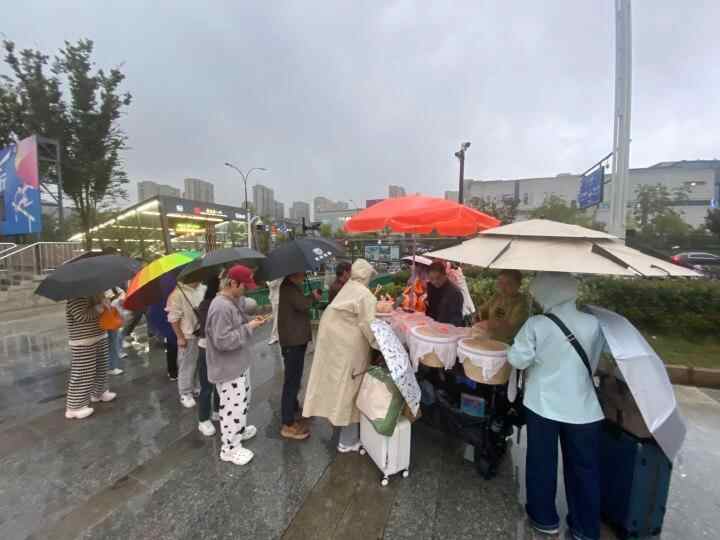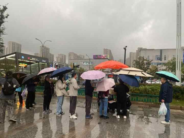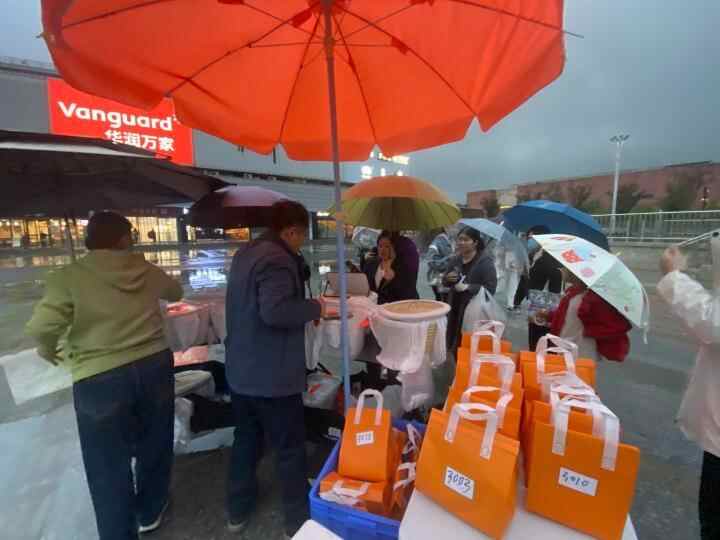 下午5点不到,下起了小雨,赵唯宏和父母推着车来到广场前,原本在沿街商铺躲雨的人突然一哄而上,朝摊子围了过去,吴女士也想冲进雨里,赵唯宏一把拉住,“提前预订的不用这么急,他们是急着去排队现场买。”
