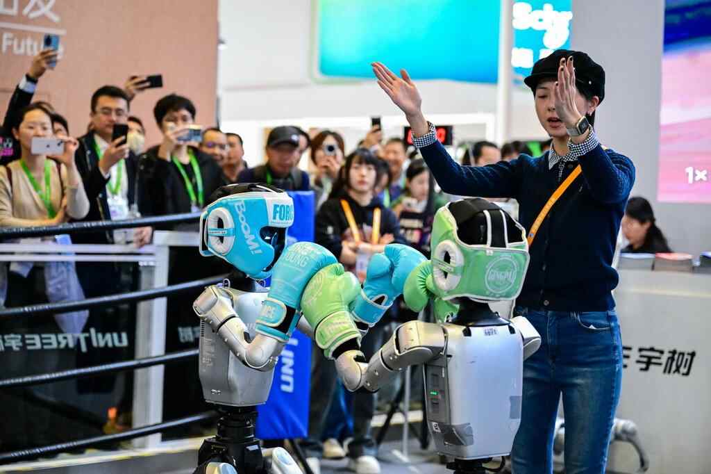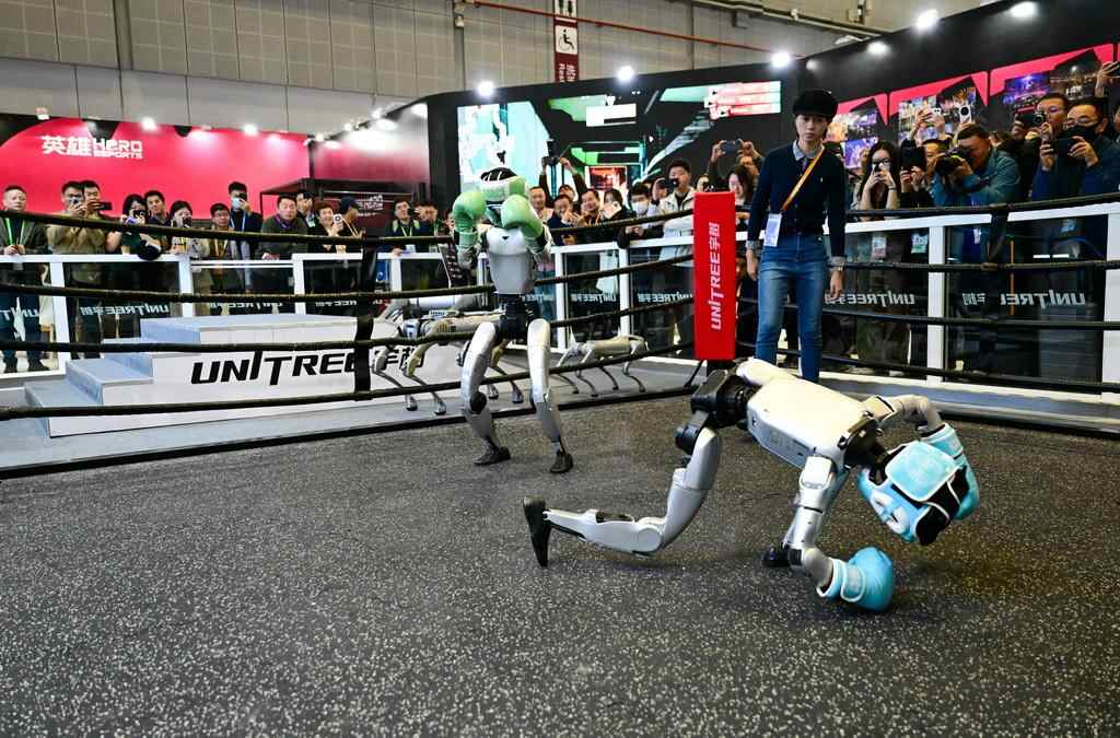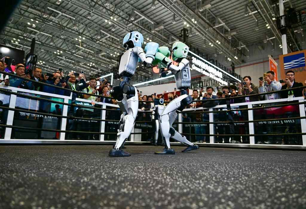 11月6日,在第八届进博会技术装备展区宇树科技展台,两台G1人形机器人的格斗表演吸引了众多观众。它们戴着护具及拳套,施展直拳、勾拳、左右鞭腿,展示倒地自主起身等复杂动作,不时赢得观众喝彩。据介绍,这款亮相表演的人形机器人身高132厘米,体重约35公斤。新华社记者 蔡湘鑫 摄
