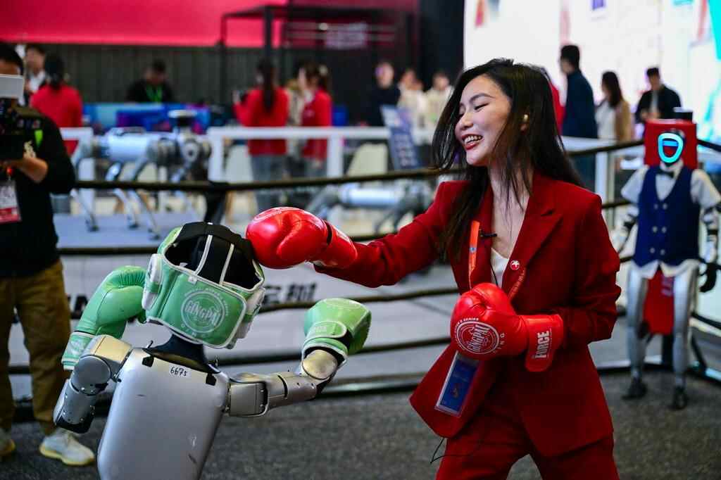 11月6日,在第八届进博会宇树科技展台,一名媒体记者与人形机器人互动体验格斗。