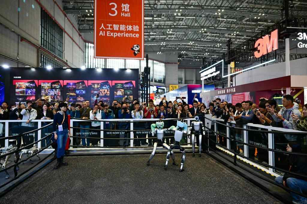11月6日,在第八届进博会宇树科技展台,人形机器人进行格斗表演。