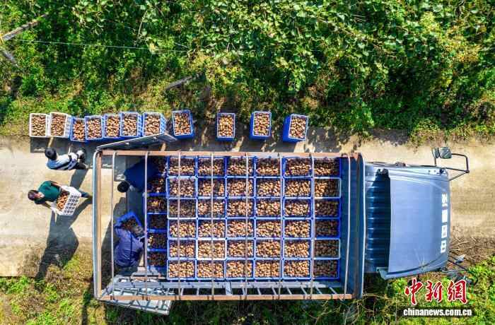 图为村民把采摘的猕猴桃装车。(无人机照片)史开心 摄