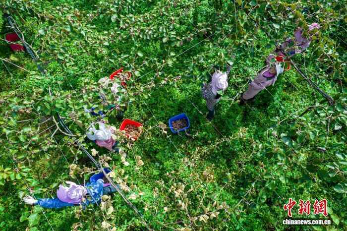 图为村民在采摘猕猴桃。(无人机照片)史开心 摄
