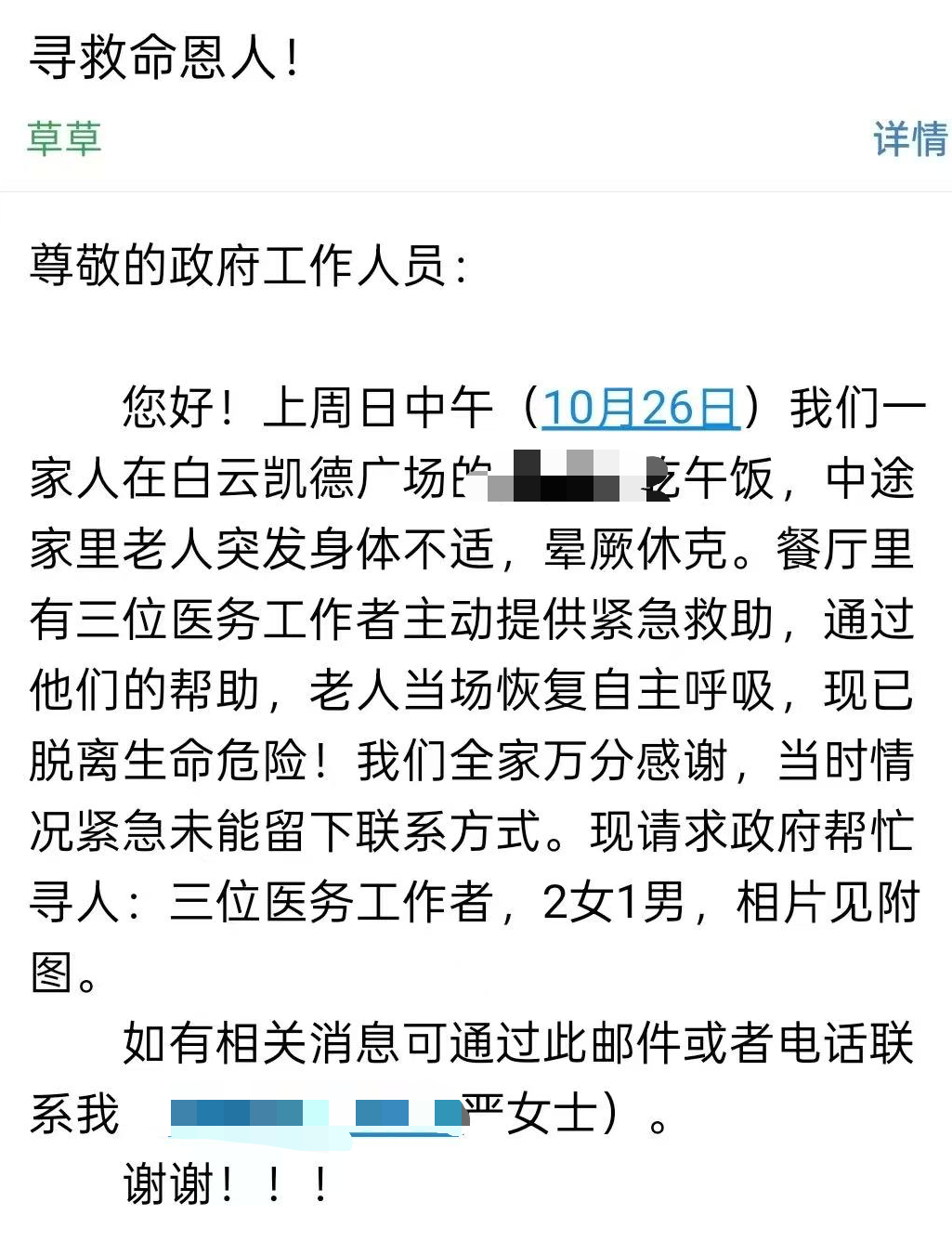 事后,老人的女儿严女士通过社交媒体发帖“寻人”,在网友热心转发下,最终联系到了冼颖丽的工作单位。