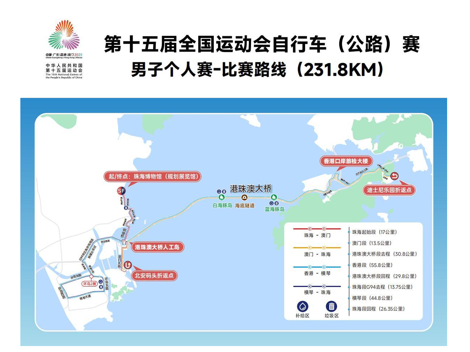 赛程分布:总里程231.8公里,分为四段——香港段55.8公里、澳门段13.5公里、珠海段117.7公里、横琴段44.8公里,选手将6次穿越三地口岸,全程无间断骑行。