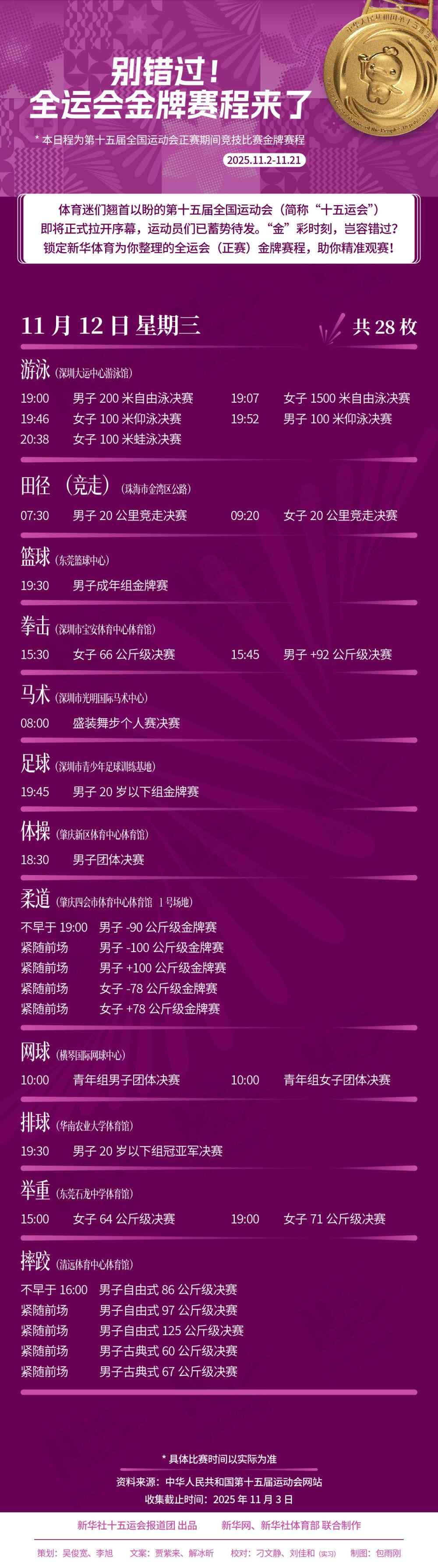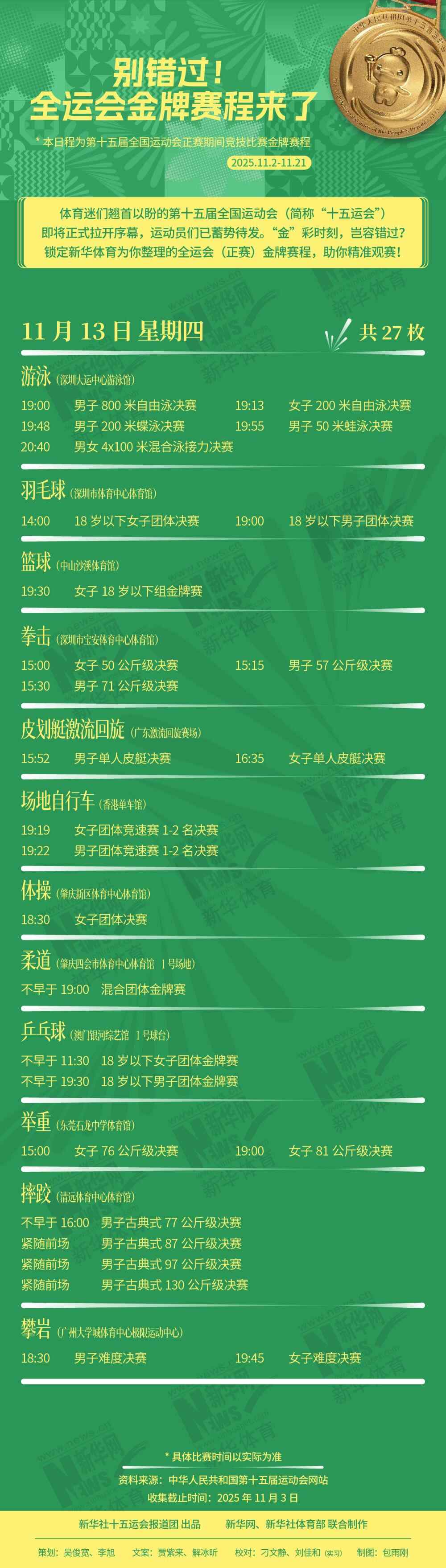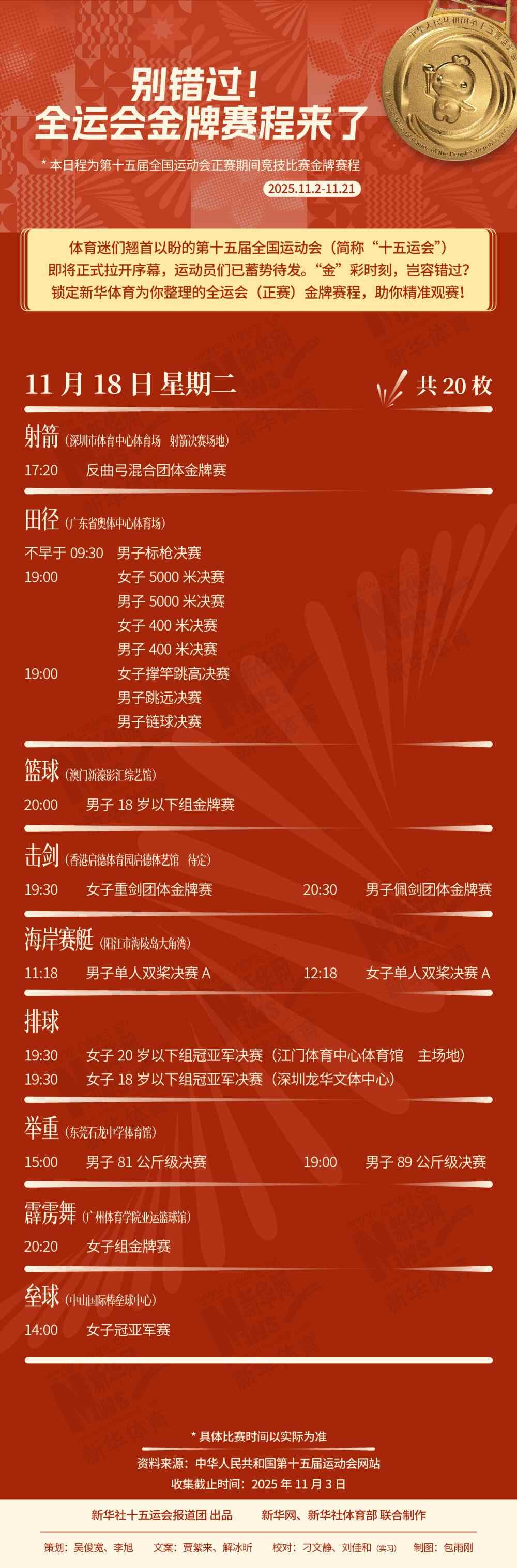 体育迷们翘首以盼的第十五届全国运动会(简称“十五运会”)即将正式拉开序幕,运动员们已蓄势待发。“金”彩时刻,岂容错过?锁定新华体育为你整理的全运会(正赛)金牌赛程,助你精准观赛!