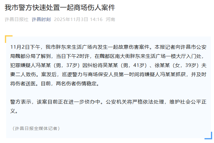 11月3日,许昌日报社官方账号“许昌时刻”发文“我市警方快速处置一起商场伤人案件”: