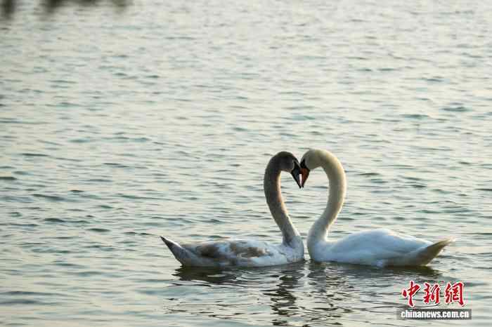 图为迁徙途中飞抵北龙湖湿地公园“歇脚”的2只大天鹅。中新社记者 范晓恒 摄