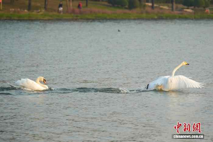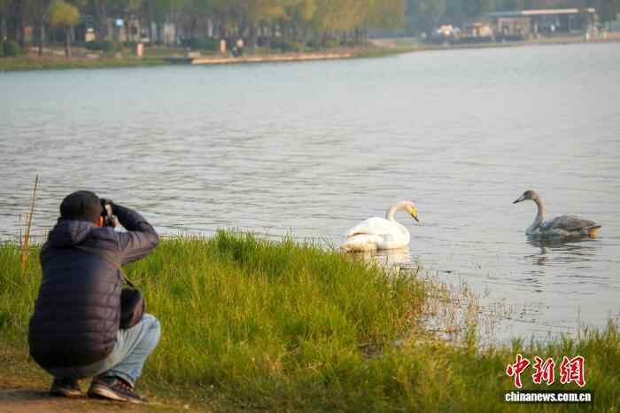 图为迁徙途中飞抵北龙湖湿地公园“歇脚”的2只大天鹅吸引游客拍照。中新社记者 范晓恒 摄