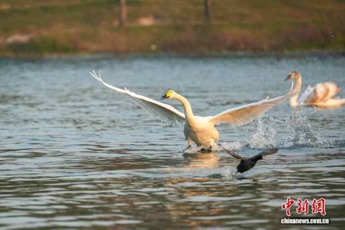 图为迁徙途中飞抵北龙湖湿地公园“歇脚”的大天鹅(右)。中新社记者 范晓恒 摄
