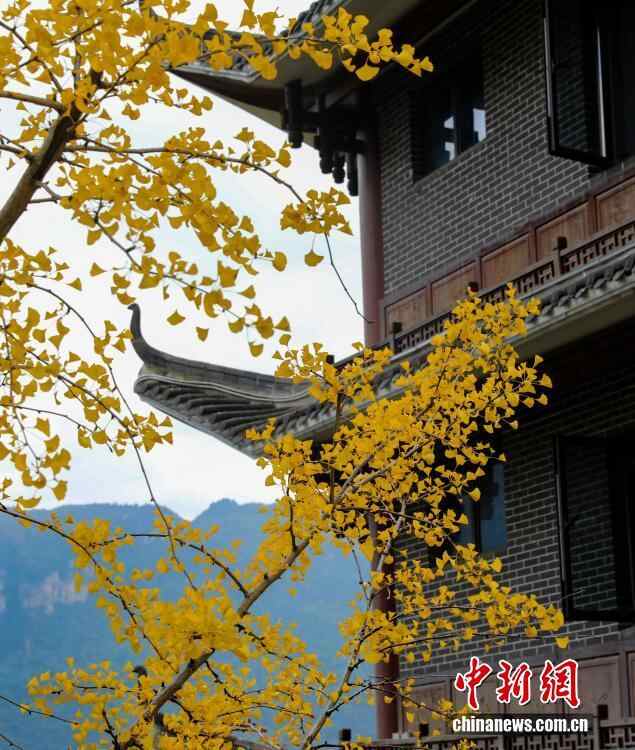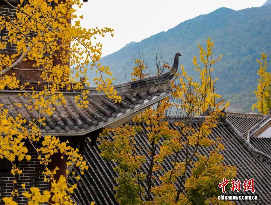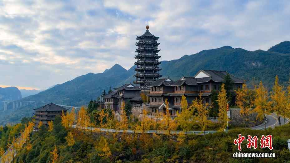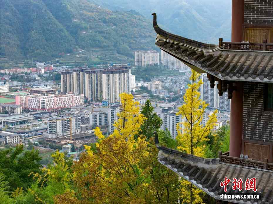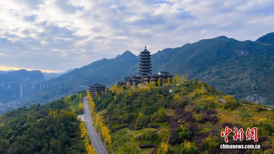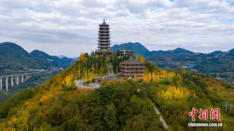 图为11月4日,贵州省毕节市赫章县塔山公园里的秋叶和古式建筑相互映衬。