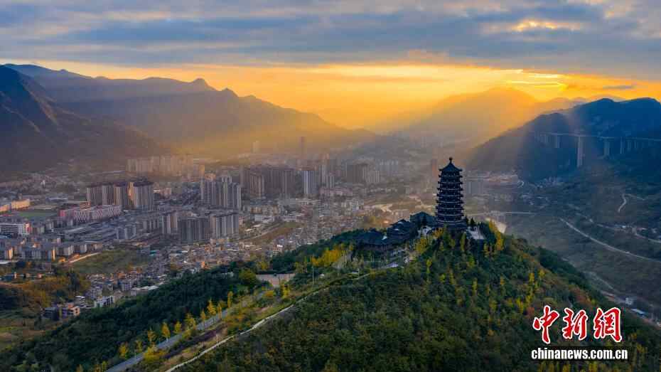 11月4日傍晚,贵州省毕节市赫章县雨后初晴,金色阳光穿透云层,为县城的楼宇、街道镀上一层暖芒。建筑与光影交织,县城及周边呈现出一幅绚烂的秋日画卷。与此同时,县城内的塔山公园正处于最佳观赏期。园内树木褪去翠绿,叶片换上金黄盛装,微风拂过,黄叶轻摇,尽显秋日浪漫。公园的自然景致与古建筑风貌相互映衬,构成了赫章秋日里独有的风景线。图为11月4日,金色阳光洒在贵州省毕节市赫章县城上空。