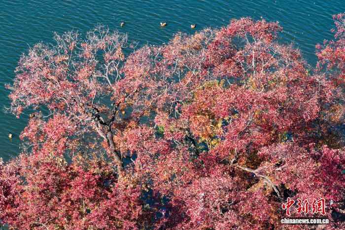 11月5日,江苏南京,紫金山前湖月牙堤迎来观赏佳期,各色树叶五彩缤纷,构成一幅绝美的秋日画卷。(无人机照片)中新社记者 泱波 摄