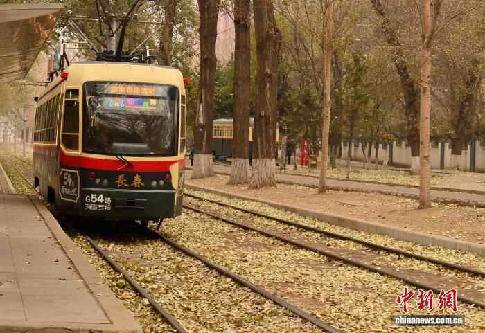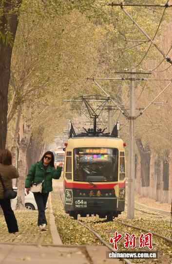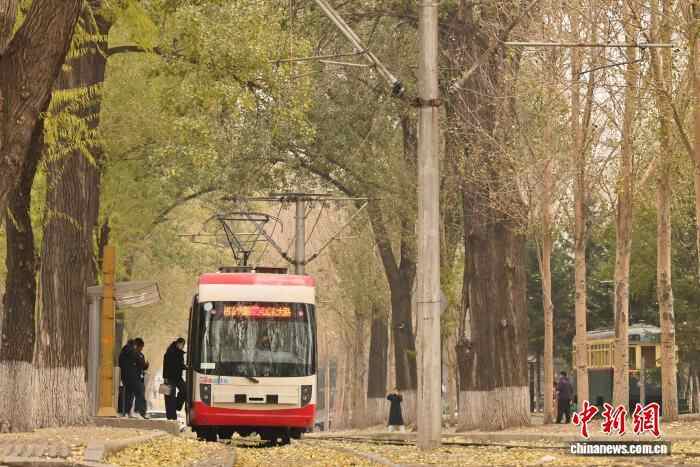11月5日,吉林长春秋意正浓,一处轨道两旁的树叶泛黄,有轨电车宛如在画中穿行,吸引游客前来拍照。 中新社记者 张瑶 摄