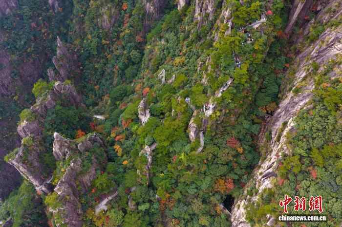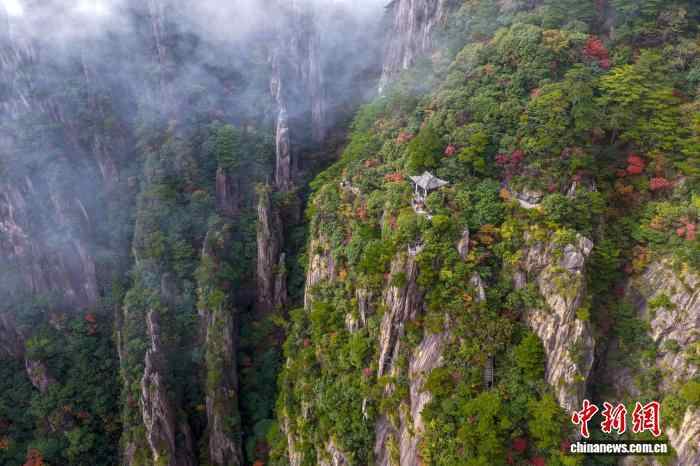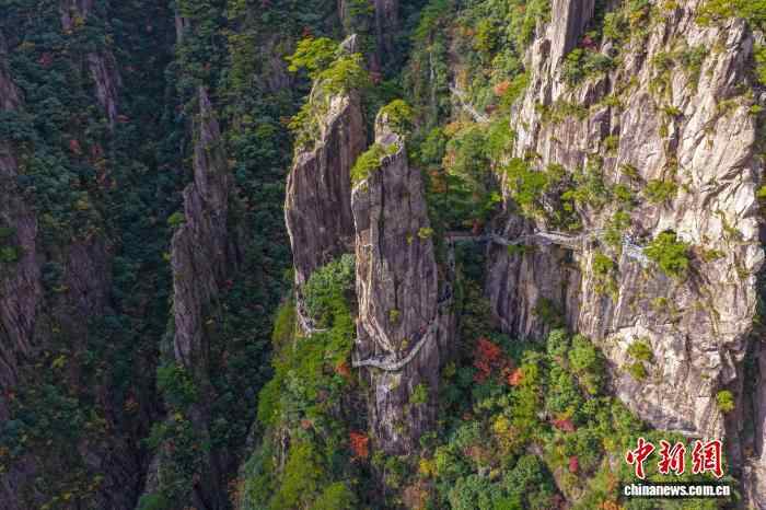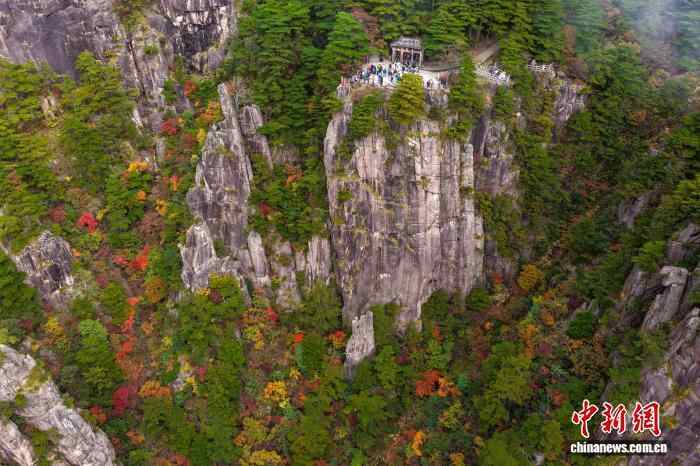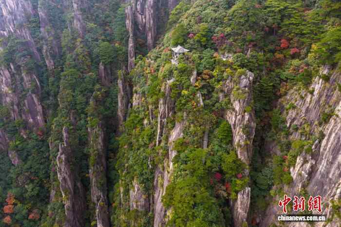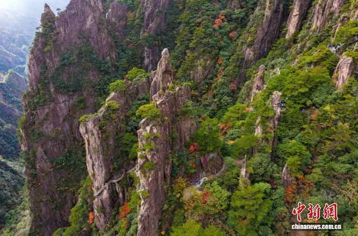 11月5日,安徽省黄山风景区西海大峡谷秋色渐浓,峰林间点缀着橙、红、黄交织的彩叶,与奇松、怪石相映成趣,引得游客驻足流连。(无人机照片)施亚磊 摄