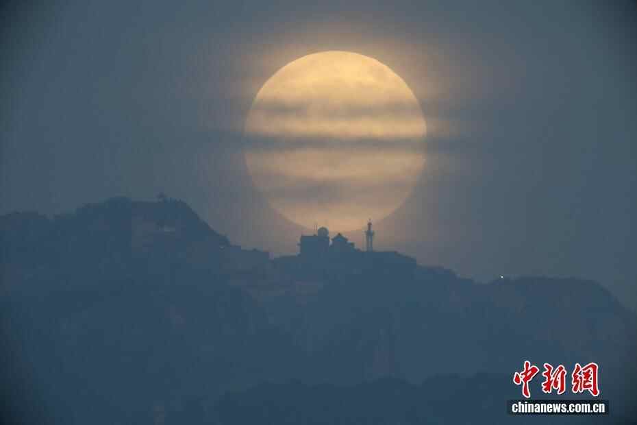 11月5日晚,本年度最大的“超级月亮”现身夜空。图为超级月亮从泰山山顶气象站升起。