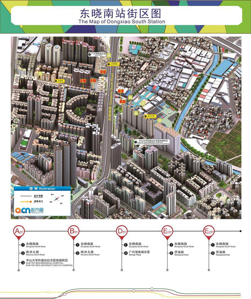 东晓南站位于海珠区东晓南路与南洲北路交汇处,周边分布大片居民住宅区,商场和食肆林立。原有的A、B口位于东晓南路东侧,D口位于东晓南路西侧,E1口位于侨港路,新开的E2口位于侨港路靠近东晓南路一侧,该口开通后,附近居民区市民出行将更加便捷。