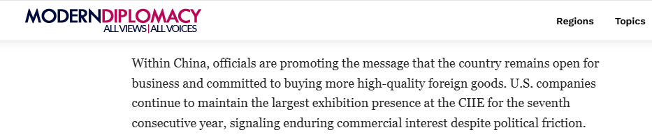 欧洲《现代外交》网站报道称,进博会是中国展示其全球经济地位的重要平台。中国政府正积极传递一个明确信号:中国将持续扩大对外开放,并致力于采购更多优质外国商品。此外,尽管存在贸易摩擦,美国企业仍连续第七年成为进博会展商数量最多的外方代表,这显示出美国企业对中国的商业热情持续不减。