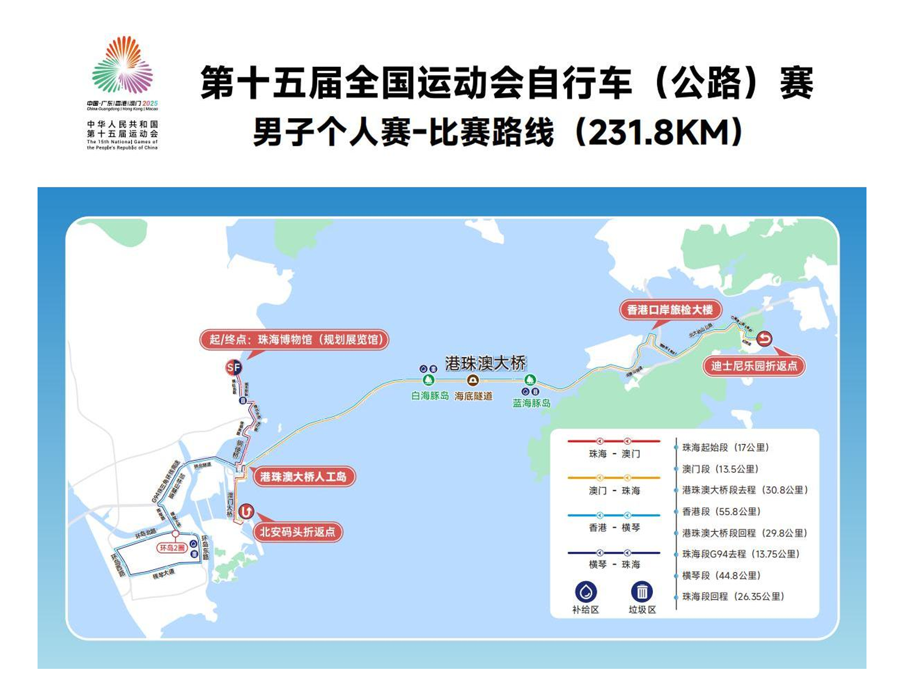 1.史上最长赛道:男子个人赛全程231.8公里,串联香港、珠海、澳门及横琴粤澳深度合作区,是全运会历史上首次跨越粤港澳三地的比赛项目。