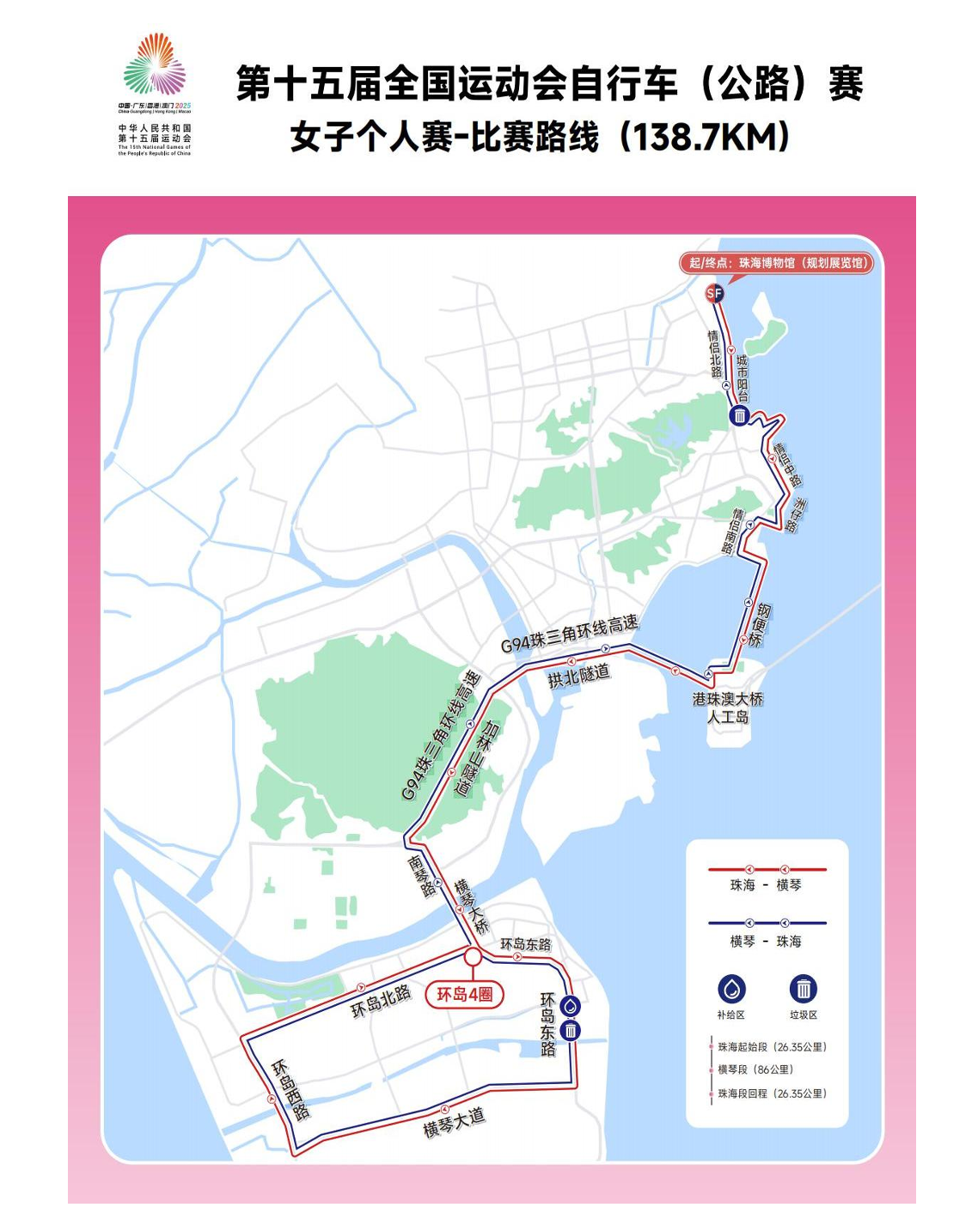 女子个人赛:起终点均在珠海,主要途经珠海市区情侣路沿线及横琴粤澳深度合作区城市道路,总里程138.7公里。