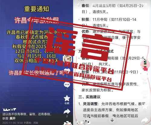真相:近日,河南、安徽部分自媒体平台发布关于中小学春秋放假的信息,声称“许昌市已被确定为河南中小学春秋假试点城市之一”“周口市中小学2025年秋假时间安排如下”“芜湖市中小学将在11月12日至14日放首个秋假,连周末共5天”,引发关注。对此,河南许昌、周口及安徽芜湖教育部门作出回应:并无放秋假的安排,网传消息均为谣言。中小学放假安排需严格遵循国家教育方针政策及当地教育部门的统一部署,结合本地教育教学实际统筹规划。如需了解相关安排,请通过属地教育部门官方网站,切勿轻信、传播未经官方确认的“小道消息”。(来源:“清朗河南”微信公众号、@大河网、安徽网络辟谣平台)