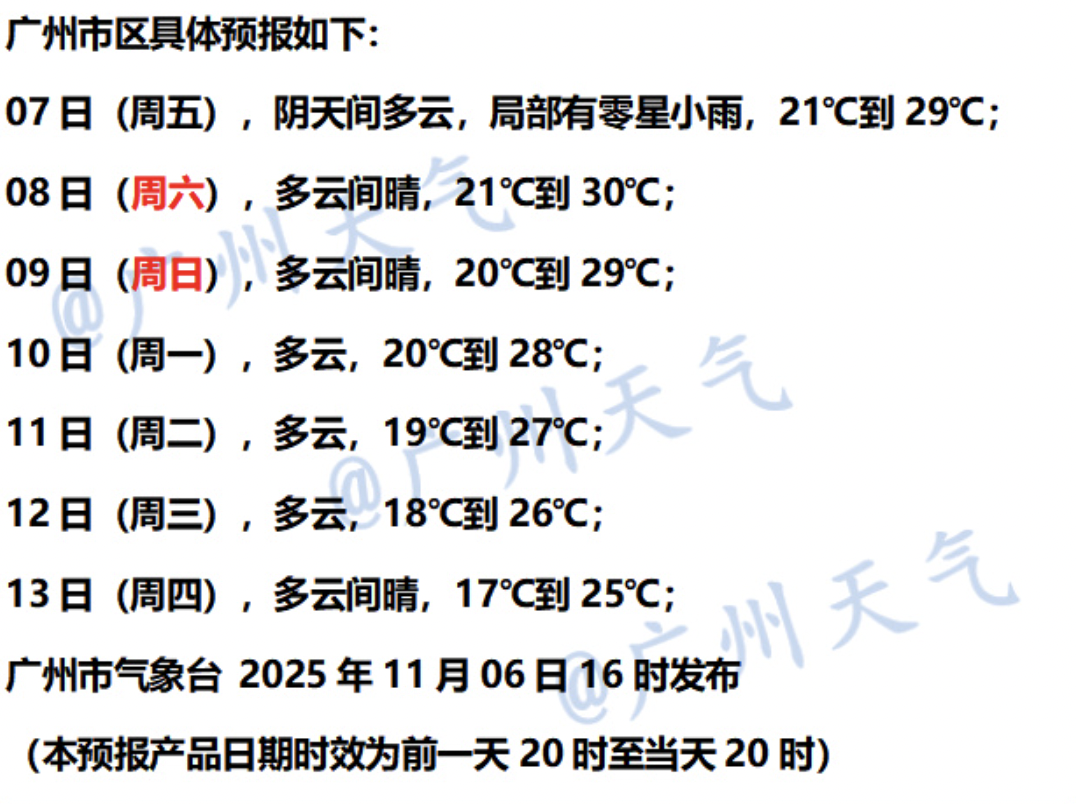 结合广州市气象台11月6日的预报,预计广州市区7日阴天间多云,局部有零星小雨;8日至9日多云间晴,其中8日广州市区的气温,预计介于21~30℃。受弱冷空气影响,9日广州市区气温将稍微回落至20~29℃;在弱冷空气进一步影响下,广州市区气温逐渐下降,预计至13日下降至17~25℃。