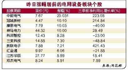 昨日,在大盘弱势下该板块指数涨近1%。主营智能电网设备制造业务和新能源产业运营的中能电气、中国特种电缆行业领军企业摩恩电气、布局输变电设备的新特电气等均受到资金追捧,股价涨幅居前。