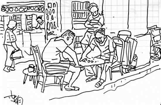 骑楼看似整齐划一,其实富有变化才是它的魅力所在,这种变化在画家眼里就是“入画”的内容,它无处不体现出时间造成的印迹,但说到底这种印迹还是由人的活动带来的,所以我们留意骑楼视觉上的变化,就是对生活在这里的人的活动感兴趣。那些住在骑楼里的人,或者在底层开铺子的店家,虽然还说不上到了占山为王的境界,但随意搬两张椅子往走廊的边边一摆,再拿一块画有格子的木板当棋盘,如此将一天中的大部分时光消磨掉,就有了我们所说的“生活情趣”。画家和摄影家都喜欢捕捉这一类画面,但我认为真正的作者就是这些下棋的人,他们不知不觉地塑造了自己的生活,我们写生和拍照只能算是隔着一段距离的记录。