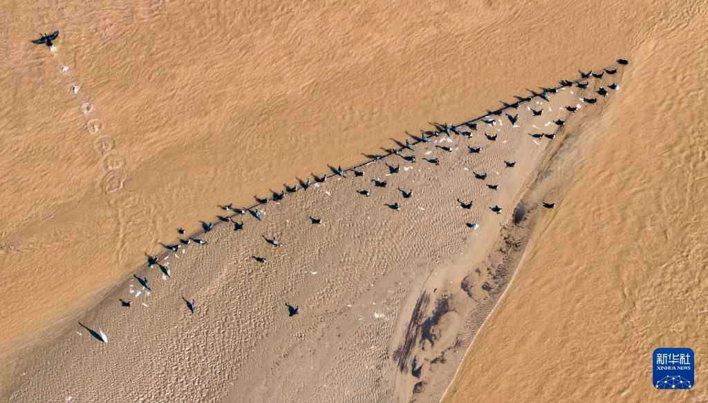 11月4日,在位于宁夏灵武市境内的黄河,候鸟在河滩上驻足栖息(无人机照片)。