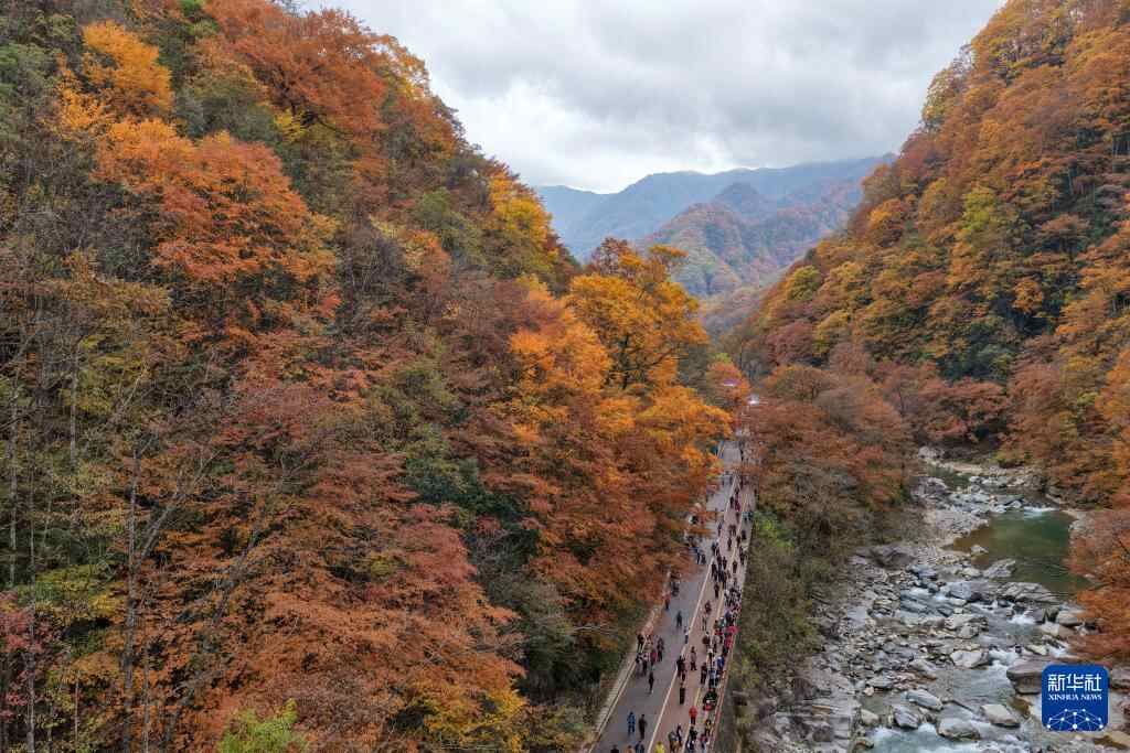 11月3日,游客在四川省巴中市光雾山景区观赏红叶(无人机照片)。