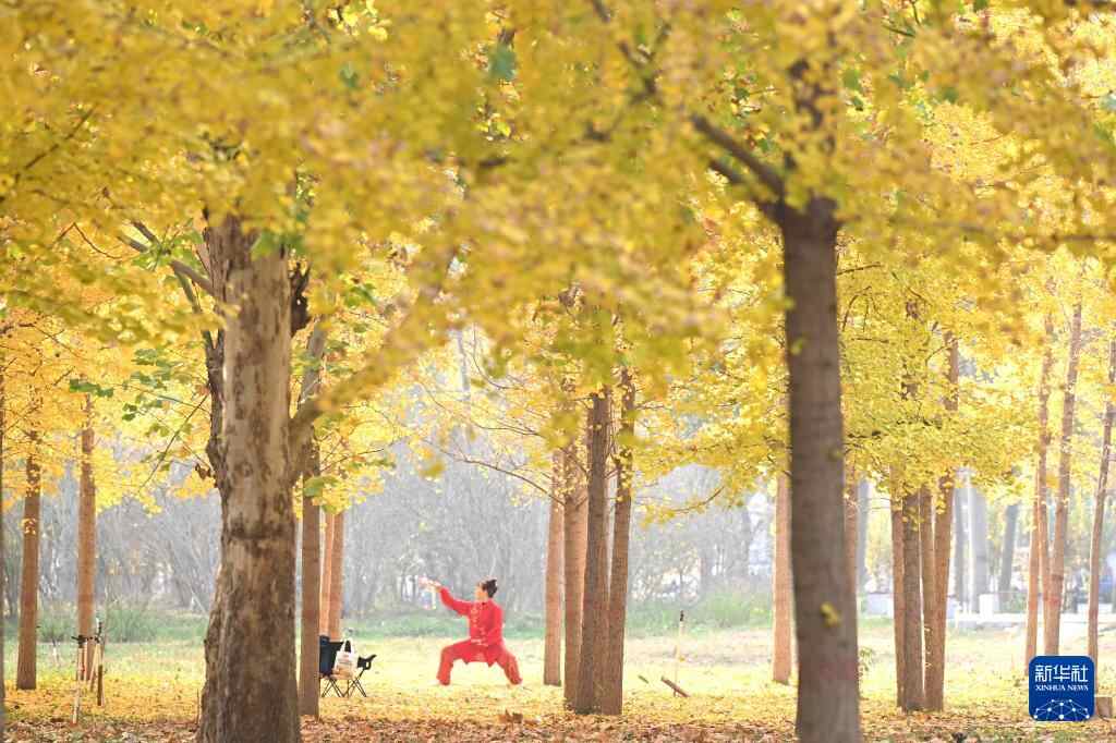 11月4日,市民在石家庄市的河北经贸大学的银杏林下晨练。