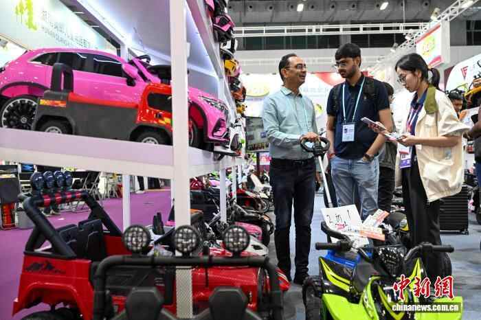 图为境外采购商在广交会玩具展区与参展商洽谈。中新社记者 陈骥旻 摄