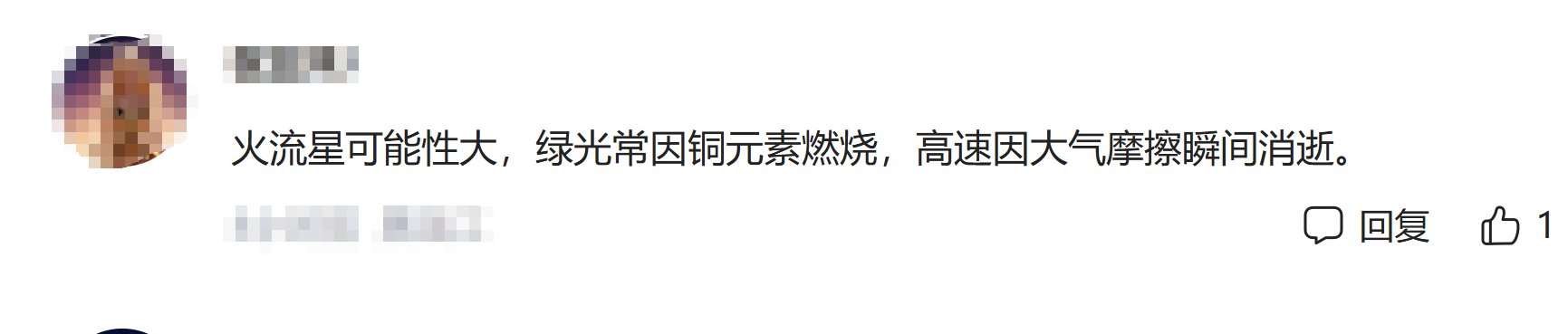 有网友表示绿色飞行物挺神秘的,还有网友猜测是火流星——