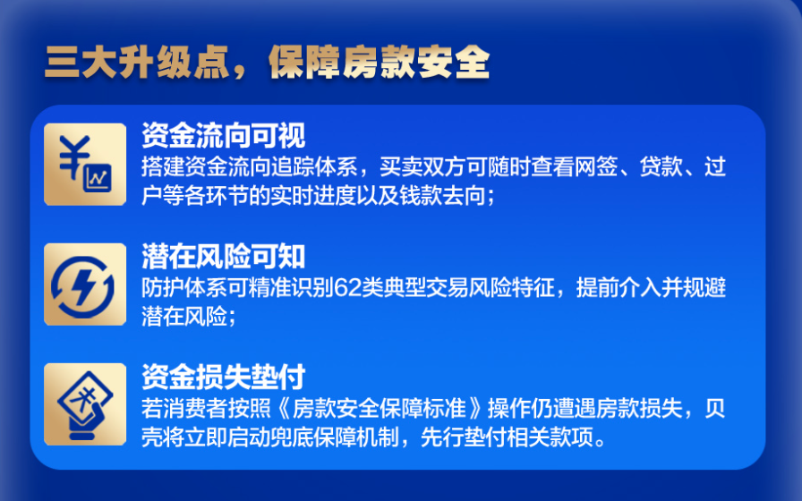 据了解,贝壳自2020年起便开始为平台促成的交易提供资金存管服务。本次房款安全服务主要包括三大升级点,包括资金流向可视化、潜在风险可知化以及对消费者而言最为重要的资金损失先行垫付。通过贝壳广州站合作品牌门店成交的二手房交易,买卖双方只需按照《房款安全保障标准》操作,一旦遭遇放款损失,贝壳将启动兜底保障机制,先行垫付相关款项。