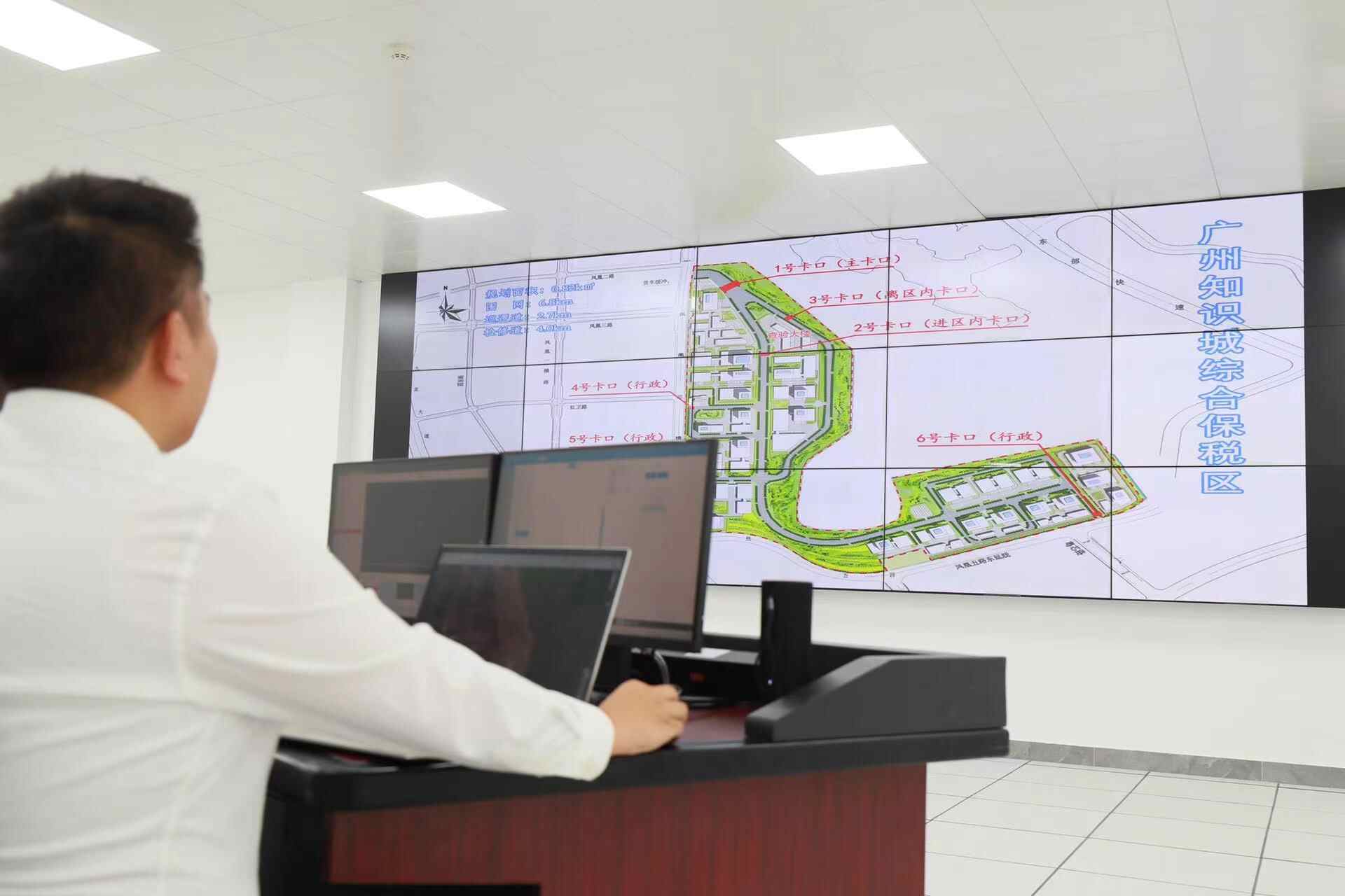在验收现场,知识城综保区视频监控指挥中心展示了园区的高水平监管能力。大屏幕上监控拍摄的画面清晰显示了查验场地的外围情况,每个卸货平台均设置单独的监控摄像机,还覆盖了暂扣室、查验通道、监管仓库、理货待查区等区域。据介绍,园区监控系统共设置高清球机44台,高清摄像机332台,确保对卡口、围网、查验场地全方位监控无盲区。
