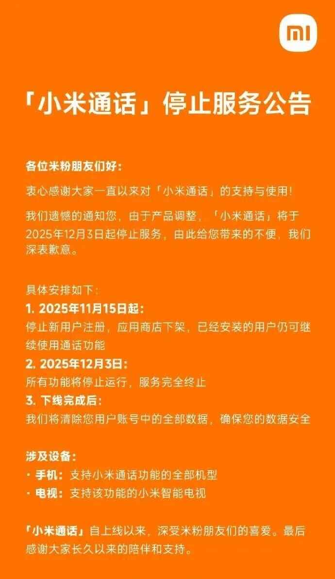 11月5日消息,小米通话近日发布停止服务公告,宣布将于2025年12月3日停止服务,停服原因为产品调整。