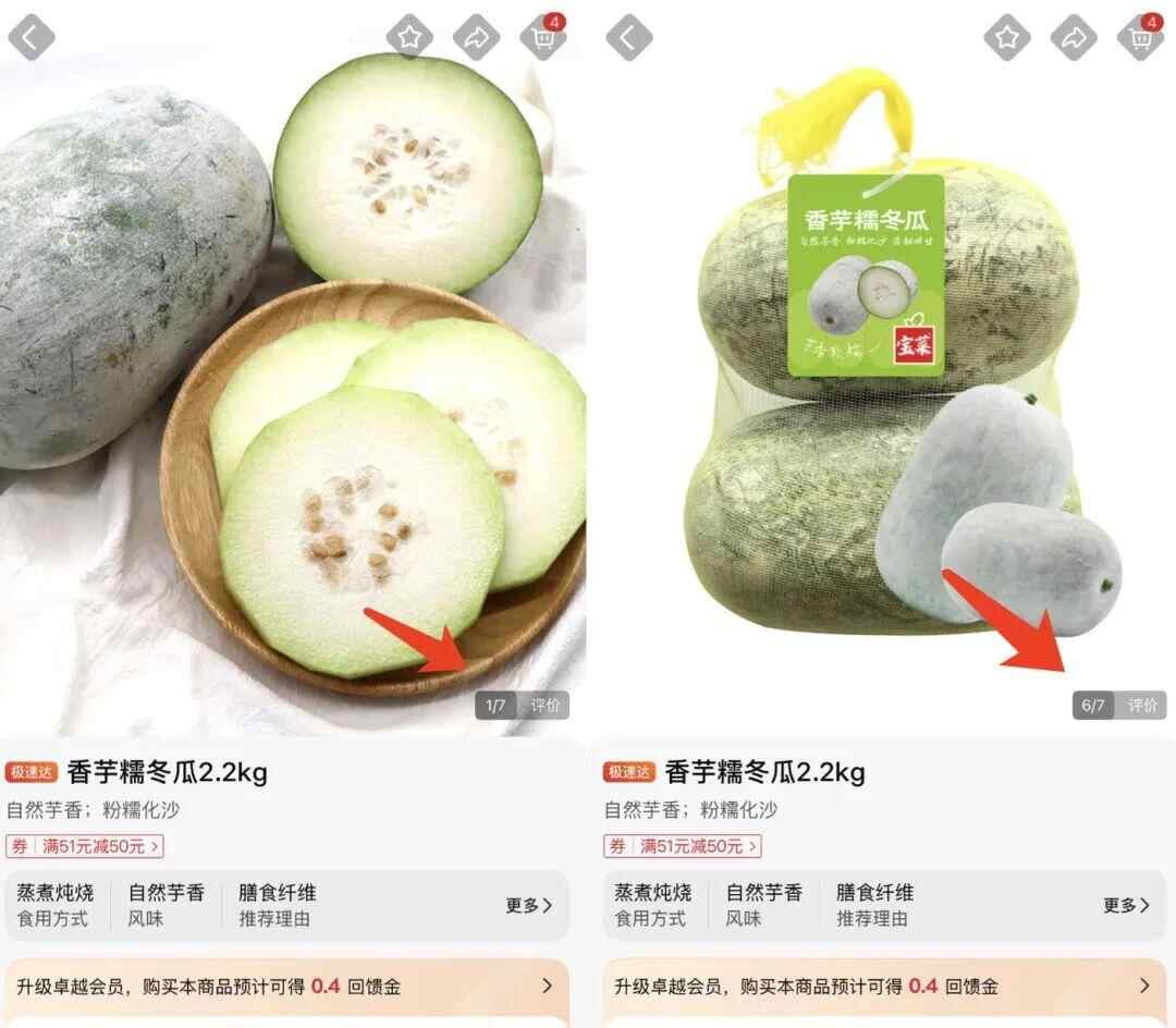 值得注意的是,果蔬类商品详情页中的实拍图并未被删除,而是被移至图片列表的末端,用户需手动向后翻阅五张经过高度美化的图片后才能看到。