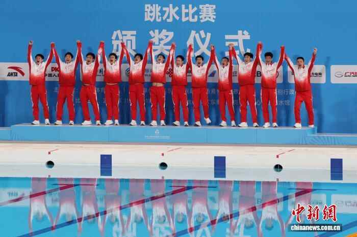 11月3日,第十五届全国运动会跳水项目男子团体比赛在位于广州的广东奥林匹克体育中心开展。当晚,广东队夺得冠军,湖北队、山东队分别夺得亚军、季军。图为广东队站上颁奖台。中新社记者 陈楚红 摄