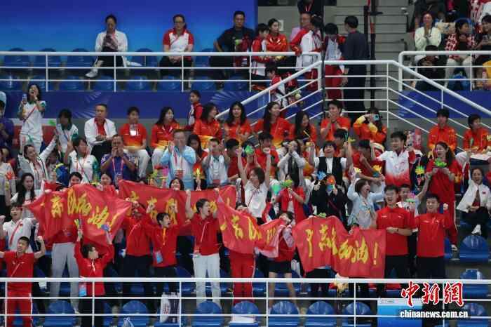 11月3日,第十五届全国运动会跳水项目男子团体比赛在位于广州的广东奥林匹克体育中心开展。当晚,广东队夺得冠军,湖北队、山东队分别夺得亚军、季军。图为工作人员和观众为广东队加油助威。中新社记者 陈楚红 摄