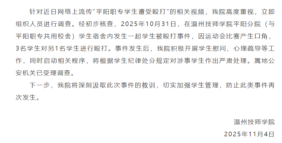 针对近日网络上流传“平阳职专学生遭受殴打”的相关视频,我院高度重视,立即组织人员进行调查。经初步核查,2025年10月31日,在温州技师学院平阳分院(与平阳职专共用校舍)学生宿舍内发生一起学生被殴打事件,因运动会比赛产生口角,3名学生对另1名学生进行殴打。事件发生后,我院积极开展学生慰问、心理疏导等工作,同时启动相关程序,将根据学生纪律处分规定对涉事学生作出严肃处理。属地公安机关已受理调查。