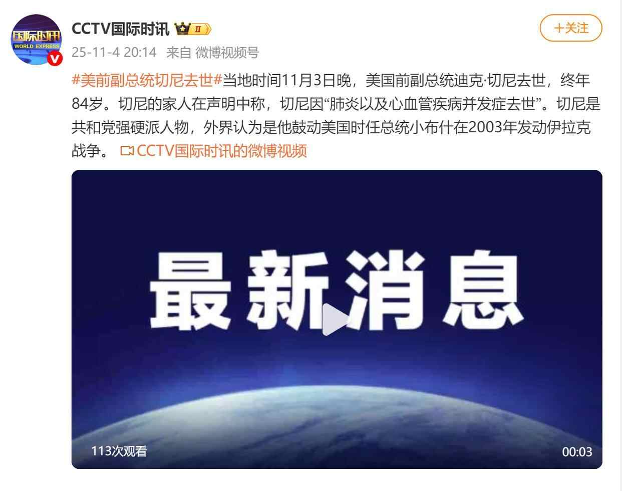 当地时间11月3日晚,美国前副总统迪克·切尼去世,终年84岁。切尼的家人在声明中称,切尼因“肺炎以及心血管疾病并发症去世”。切尼是共和党强硬派人物,外界认为是他鼓动美国时任总统小布什在2003年发动伊拉克战争。