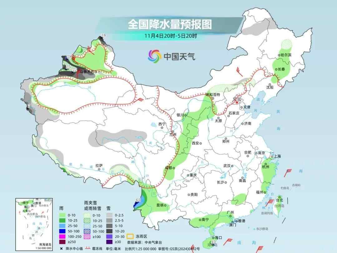像乌鲁木齐,雨雪相态复杂,今天晚上开始下雨,之后随着气温下降逐步转雪,明天将是雨雪混杂转暴雪的天气,6日降雪将减弱并且逐步停止,降水将持续近48小时。