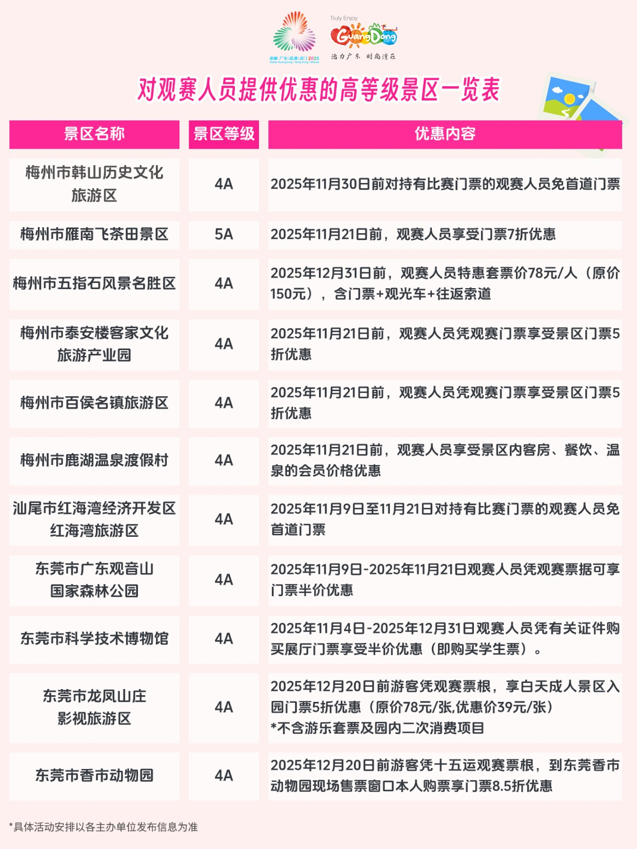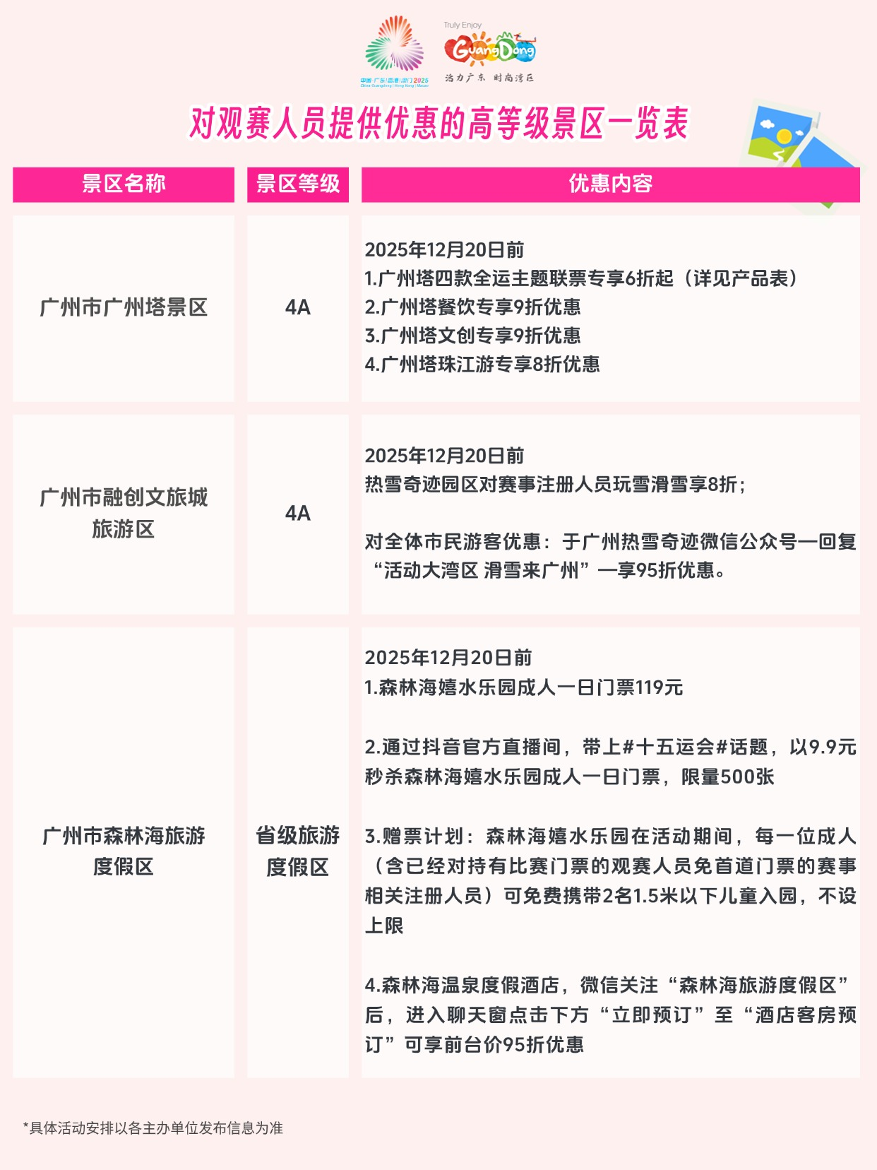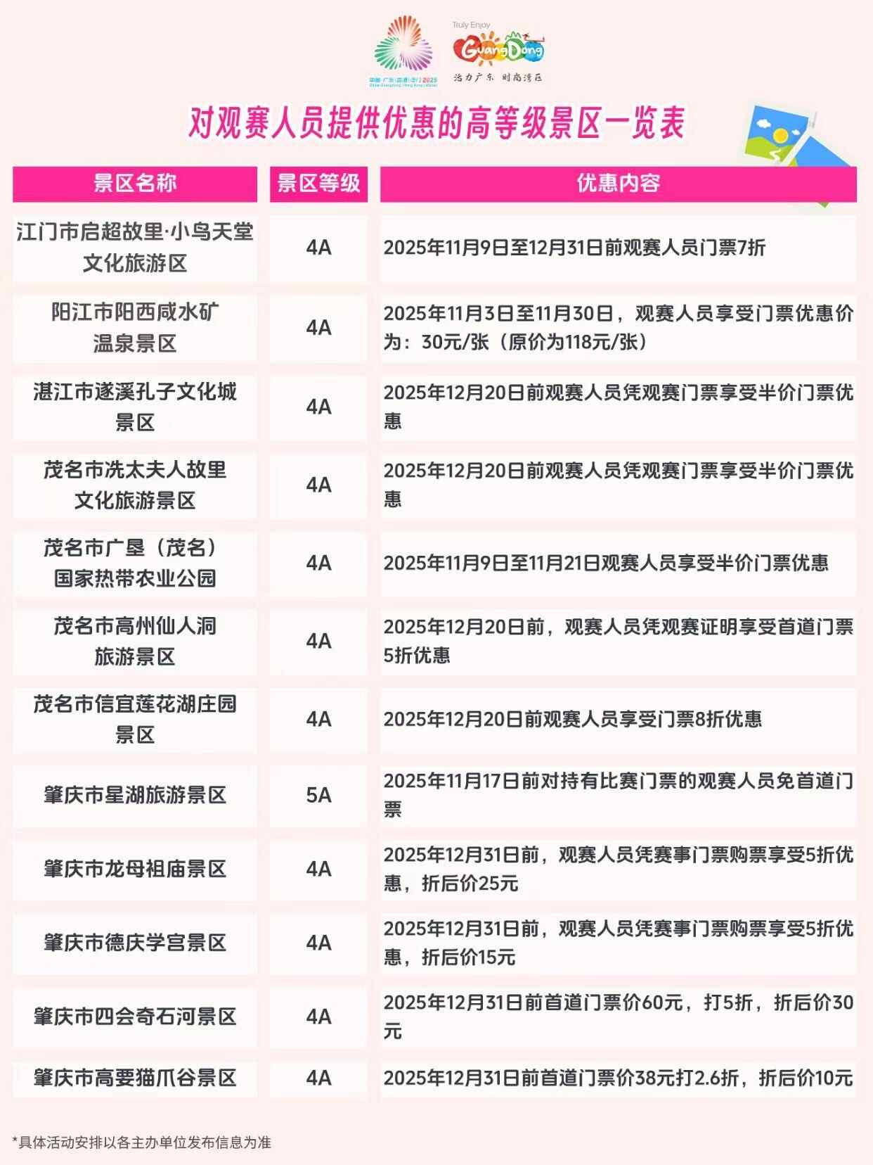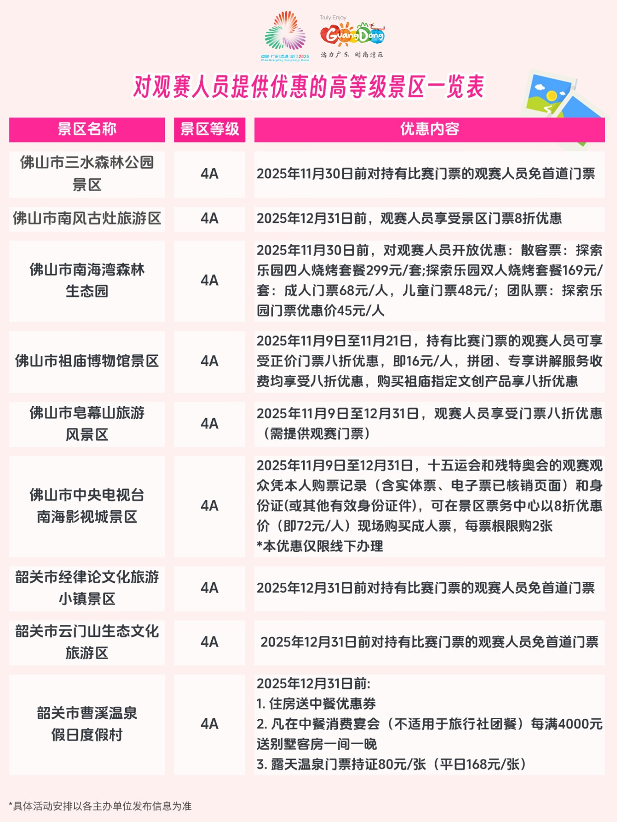 为营造“全民全运、共享盛事”的良好氛围,全省超过100家4A级以上旅游景区和省级以上旅游度假区同步面向观赛游客推出形式多样的游览优惠,包括门票折扣、联票套餐及特色体验活动,让广大观众在观赛之余,能够轻松畅游广东,深入感受岭南文化的独特魅力。活动期间,各地还将发布本地区优惠景区名单。我们诚挚邀请各地运动员与游客在这个冬天走进广东,在温暖气候与诚意礼遇中,共赴一场“看全运、游广东”的难忘旅程。